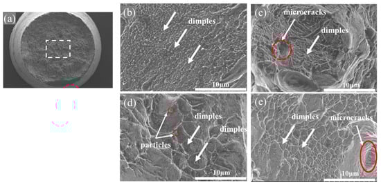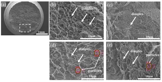 To investigate the fracture mechanism of the material under dynamic tensile testing, SEM observations were conducted on the fracture center and edge regions of fracture samples, while the sampling locations are illustrated in Figure 10a and Figure 11a, respectively. The SEM images of the fracture center under different strain rates are presented in Figure 11. The dimples in the matrix with different distributions indicate that the fracture mechanism of TWIP steel is characterized by ductile fracture. When the strain rate is 1000 s−1, the dimples shown by the white arrow in the figure are small in size and shallow in depth but densely distributed, so the toughness is good at this time, which is shown in Figure 10b. As shown in Figure 10c, the number of dimples remarked in the white arrow decreases, and larger holes remarked in the red circular dotted box are formed under the strain rate of 3000 s−1. These holes provide energy paths for crack formation and lead to a significant reduction in plasticity, at which time the TWIP steel exhibits the worst plasticity [44]. When the strain rate is raised to 5000 s−1, the dimples become larger and deeper, which is shown in Figure 10d. The Energy Dispersive Spectrometer (EDS) results in Figure 12 indicate that small particles near the dimples are mainly oxides of Fe and Mn. They are evenly distributed in the matrix and contribute to dispersion strengthening, which enhances the fracture elongation a of the TWIP steel [45]. At the strain rate of 6500 s−1, which is shown in Figure 10e, the number of dimples increases, but the large holes serve as potential crack initiation sites, resulting in poorer plasticity at this strain rate. The SEM image of the fracture edge region is shown in Figure 11. At a strain rate of 1000 s−1, the dimples are observed to be larger and deeper, exhibiting a uniform distribution. However, as the strain rate is increased to 3000 s−1, the dimples become shallower and are distributed non-uniformly. Conversely, the depth and size of the dimples increase at a strain rate of 5000 s−1, accompanied by an increase in the number of particles in the vicinity. At 6500 s−1, the number of dimples remains relatively unchanged, but their depth decreases. The SEM observations of the fracture morphology at both the center and edge demonstrate analogous trends, and the variation in material plasticity with strain rate is consistent across both regions.