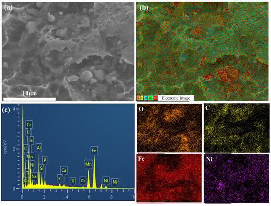 - Macroscopic fracture morphology evolves with strain rate, yet the microscopic fracture mechanism remains ductile across all rates. At 5000 s−1, Fe and Mn oxides are evenly dispersed within the matrix near the dimples, contributing to plastic strengthening.