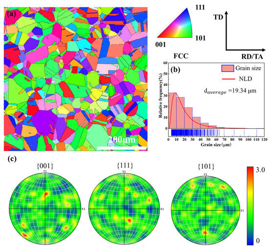 The first original sample IPF figure calculated the average grain size, and normal logarithmic distribution (NLD) curves were obtained by using EBSD technology, which are shown in Figure 13. EBSD analysis indicates that the material was completely austenitic, with an average grain size of 19.34 μm and annealing twins. In addition, no preferential texture was found, which is critical for evaluating the microstructure evolution during deformation.