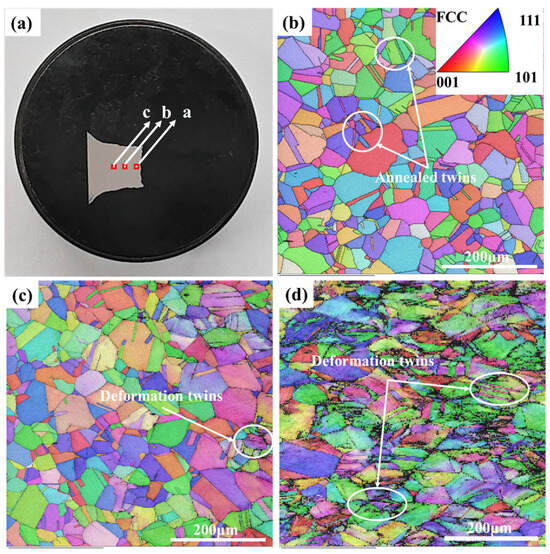 EBSD images of the specimen at different distances from the fracture under a strain rate of 1000 s−1. (a) Sampling points; (b) EBSD map of point c; (c) EBSD map of point b; (d) EBSD map of point a.