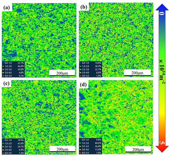 GND images of the specimen at different strain rates. (a) 1000 s−1; (b) 3000 s−1; (c) 5000 s−1; (d) 6500 s−1.
