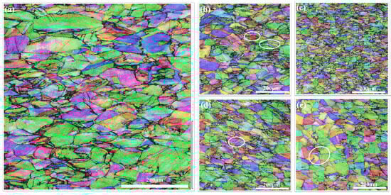 Figure 16 shows the EBSD diagram of the fracture of TWIP steel after tensile fracture in the central part with a strain rate of 10−4 and 1000–5000 s−1. It can be seen that part of the deformation twins penetrate through the entire original grain during quasi-static loading, which makes the grain of the material refined, which is shown in Figure 16a. At this time, the zero resolution at the grain boundary is relatively large, which is due to the staggered entanglement of the dislocation, which aggravates the stress concentration at the grain boundary, and micro-cracks are easy to initiation and expansion, resulting in the failure fracture of the material, and the volume fraction of the twin boundary is 15.9%. The increase in strain rate makes the stress concentration of the material more serious than that of the quasi-static state. At a strain rate of 1000 s−1, deformation twins appear inside the grain, as shown in the white wire frame in Figure 16b, and the ratio of the twin boundary is 10.2%. When the strain rate is 3000 s−1, which is demonstrated in Figure 16c, the proportion of twin boundary is 9.29%, and the degree of grain refinement and breakage is high. The percentage of unresolved area around the grain boundary increases to 20.6%, which indicates that the stress concentration of the material is serious at this strain rate, and the nucleation and expansion of crack sources are easy to occur near the grain boundary, so the plasticity of the material is relatively low. When the strain rate is 5000 s−1, the proportion fraction of twin boundary is 8.58%, and a secondary twin system with different orientation from the initial deformation twin appears inside the grain, and the angle between the secondary twin and the initial twin is 57.8°~59.8°, which accords with the Angle range between the initial twin and the secondary twin [50], the white wire frame also shows the deformation twins in grain in Figure 16d. The two groups of twins deliver each other during the stretching process. The plasticity of the material is improved at this time as the grain is further divided into multiple pieces and refined by the twins. The strain rate gradually increases to 6500 s−1, and the fraction of twin boundary increases to 18.7%. The reduction of grain breakage degree shown in Figure 16e is due to the fact that multi-twin system shown in the white circular frame formed inside the grain can absorb deformation energy and thus reduce stress concentration. The relevant study shows that the increase of grain size leads to the decrease of the critical stress generated by deformation twins, resulting in the continuous formation of deformation twins during tensile deformation, resulting in continuous work hardening effect, with obvious “TWIP effect” [51], and the increase of secondary twins.