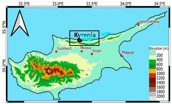 Kyrenia within the topographic map of Cyprus, showing the geographical characteristics [71].