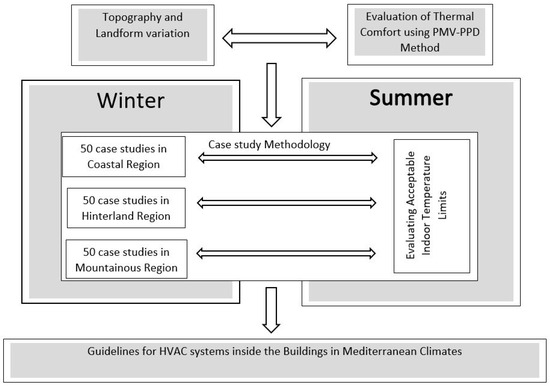 This study tries to explore the effect of various landforms and topography in the Mediterranean climate of North Cyprus on indoor acceptable thermal temperature ranges for maintaining thermal comfort inside buildings. This is through developing indoor thermal comfort guidelines for residential buildings as the dominant building sector in the Mediterranean climate of Northern Cyprus [17]. This study aims to improve sustainable design criteria in buildings by enhancing occupants’ well-being and productivity in Mediterranean climates. This is through determining the threshold of acceptable temperature for maintaining thermal comfort and energy efficiency inside the buildings for summer and winter in this region while considering the various topography and regional landforms. This study tries to explore whether the indoor accepted temperature limits are changing according to topography and landforms in the Mediterranean climates and to what extent it can be significant in sustainable design. This research employs the predicted mean vote and predicted percentage of dissatisfied (PMV-PPD) index by looking at human and environmental factors, which can help to comprehend permanent thermal well-being within the frame of sustainability. This approach enhances energy efficiency and aligns with global sustainability targets, meeting the urgent need for climate-responsive architectural design in regions experiencing severe climatic changes [5].