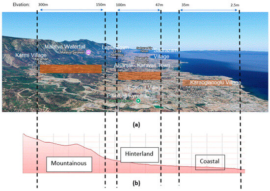 (a) Kyrenia city (bird’s eye) with its various topographies; (b) the land-form analysis of topographic regions, coastal, hinterland, and mountainous regions with specific elevations within the context of this study.