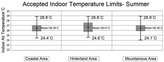 Previous studies demonstrated that the building occupants accepted thermal temperature (neutral temperatures) change according to the climatic zones. For example, in hot regions, neutral temperatures exceeded those in colder areas, and winter neutral temperatures were lower than summer temperatures within the same location [61,62]. This finding is frequently used in debates about indoor environments, where attempts are made to develop building and space designs that keep users at a comfortable temperature limit without requiring excessive heating or cooling. Moreover, studies showed that the residents’ satisfaction rises when they directly regulate thermal settings, such as the thermostat [63,64].