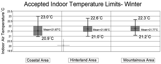 The results showed that, in the coastal location, the minimum air temperature needed to reach a thermally neutral level within the building during the winter was 20.2 °C. In order to maintain a better range of acceptable thermal temperature conditions in the winter, the minimum needed air temperature for the heating active systems in each topographic zone was determined. See Figure 6.