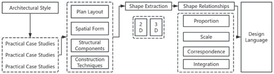 The rules are typically expressed in the form a→b, where “a” is referred to as the Left-hand Side (LHS) shape and “b” as the Right-hand Side (RHS) shape. According to an open textbook on computer-aided design from the Department of Architecture at the Massachusetts Institute of Technology (MIT), the basic design process for applying Shape Grammar involves the following steps: determining the basic shape, defining spatial relationships, establishing rules, specifying the shape language, and applying these to the design [13]. To apply Shape Grammar in specific architectural design contexts, it is essential to first abstract the plan layout, spatial form, and structural configuration of a building into two-dimensional or three-dimensional geometric shapes. Subsequently, the proportions, scales, and functional relationships within the object of study are distilled into shape rules, thereby converting architectural styles into a design language that facilitates clear and concise descriptions [14] (Figure 1).