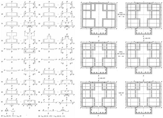 Analytical Shape Grammar: This branch is used to analyze classical architecture, traditional architectural forms, or buildings with uniform and well-defined appearances. Initially, Stiny posited that while graphical computation relies on visual perception, Shape Grammar provides a visual design process that transcends graphical computation’s predictability [20]. Early research focused on analyzing the generation of complex geometric shapes at the two-dimensional level. For instance, Stiny’s 1977 analysis of traditional Chinese residential window patterns, particularly ice-cracked windows, illustrated shape evolution rules through numerous diagrams [21]. Subsequently, Shape Grammar was applied to architectural analysis, with Stiny and Mitchell’s 1978 study of the Palladian villa marking the first architectural design application [22] (Figure 2). This pioneering work inspired further analyses of traditional Japanese tea rooms, Buffalo houses in the United States, Frigellio apartments in Trani, and additional Palladian villas [23,24,25,26].