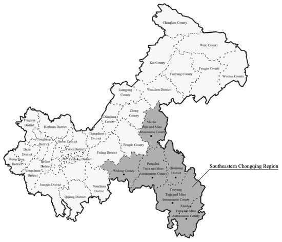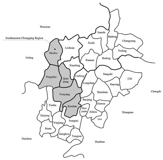 The Tujia ethnic group, one of China’s major ethnic groups with a long history, is primarily distributed in the Wuling Mountains bordering Hunan, Hubei, Chongqing, and Guizhou. In Chongqing, the Tujia people mainly reside in the southeast, including Qianjiang District and the minority autonomous counties of Shizhu, Pengshui, Youyang, and Xiushan (Figure 5 and Figure 6). This region is characterized by a high concentration of ethnic minorities and distinct ethnic features (Table 1), hosting numerous traditional ethnic villages where the Tujia population can constitute over one-third of the local populace [6]. Consequently, studying Tujia traditional dwellings in southeast Chongqing is a vital component of research on traditional dwellings in the region.