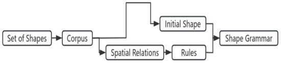 The purpose of constructing a Shape Grammar is to express a “design language” by extracting or constructing a corresponding design grammar and organizing the different design elements in the shape library with specific rules to generate a language. The basic logic of grammar must contain a “shape” and a corresponding “rule”. The application of the rule requires determining the transformation relationship between shapes and the label anchor point, with an initial starting point, i.e., the initial shape. Therefore, creating a Shape Grammar set can consist of the following stages (Figure 7):