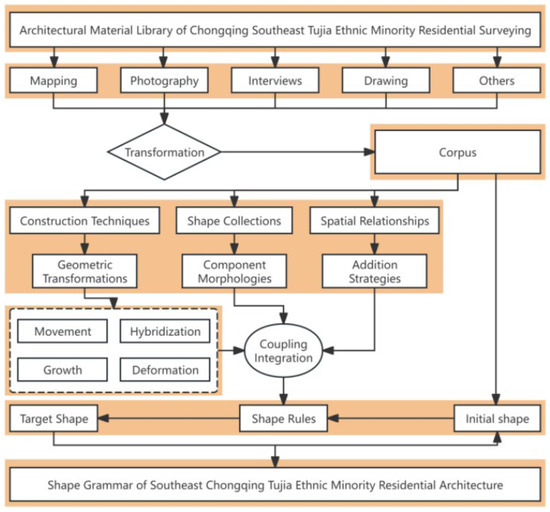 This study utilizes Shape Grammar to analyze Tujia ethnic dwellings. Initially, it introduces Shape Grammar into the study of the complex traditional wooden framework system of Tujia dwellings. Furthermore, in terms of research depth, this study begins with the basic unit of traditional dwelling construction—the framework—and introduces specific rules into three-dimensional geometric transformations. This approach transcends the previous limitations of Shape Grammar, which were confined to planar combinations or single planes and attempts to explore modern considerations based on traditional dwelling construction patterns.
