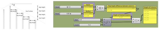 Therefore, through the constraints of Bu Chi and Bu Shui, grammatical rules can be established to qualify the height difference in the columns. Given that the height of the central column has a common value, the heights of the hypostyle columns and eave columns can be correspondingly determined, thereby establishing the Bu Shui relationships and forming of the roof surface (Figure 10).