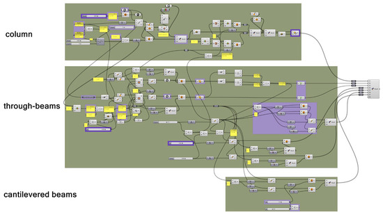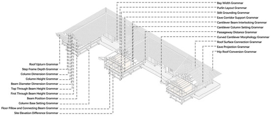 The logic for generating columns and through-beams has been established, and by superimposing the generation grammar of cantilevered beams, the grammar for a single roof truss is also established. Regarding the bay dimensions of the side houses, the traditional Tujia “Zhang-Ba-Ba System” (eight-based dimension rule) can be referenced. The “Zhang-Ba-Ba System” is a local construction custom that applies numbers ending in “eight” to traditional architectural dimensions [43]. Typically, the main hall bay is set at one zhang four chi eight cun (approximately 4.736 m), and the widths of subsequent bays are reduced by one zhang sequentially, such as one zhang three chi eight cun (approximately 4.416 m), one zhang two chi eight cun (approximately 4.096 m), etc. By overlaying a numerical operation of bay dimensions on a single roof frame and establishing corresponding grammatical rules for longitudinal connecting components, such as the “main gate beam” above the eaves, floor beam, and purlins, the overall structural logic of the building is replicated (Figure 11).