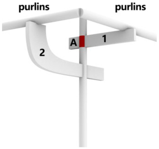 The connection methods between the main house and the side house vary, including “L”-shaped intersections and “T”-shaped intersections. There are also cases where the main house and side house do not connect at all. A distinctive practice is to leave a separate transfer space at the intersection and then install an “umbrella handle column” at the intersection part of the ridge of the side house [44]. Simultaneously, a slanting ridge is extended from the top of the column to the corner column to support the purlins in both directions, thereby completing the transfer of the roof frame in both directions. The umbrella handle column can be considered an outstanding achievement in the construction of traditional Tujia houses, and its invention plays a key role in the intersection of the Tujia main house and the side house. Its setup can be divided into two scenarios [45]: