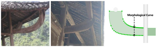 The Tujia corner building is the most intensive part of the structure and the most prominent part of the house’s outline, serving as one of the important symbols for recognizing Tujia houses (Figure 18). The wall of the corner house is usually covered with a hipped gable roof-style roof, supported by a series of purlins, columns, trailing beams, and picking beams in different positions. The structural connection is very complicated, often resulting in positional conflicts where multiple components need to be inserted in the same location. The response to this problem is an innovative Tujia residential construction skill: a more curved pick.