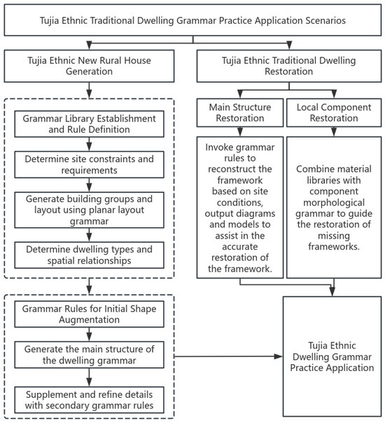 The current practical applications of dwelling grammar are primarily twofold. First, it involves the conservation and restoration of existing Tujia ethnic dwellings. By invoking corresponding materials and grammar from the material library and rule set, this process assists in the reconstruction of specific architectural structures. Second, it pertains to the generative design of new Tujia rural houses. Inputting the relevant site conditions and layout requirements allows for the stepwise application of grammatical rules to produce floor plans and dwelling styles. Furthermore, secondary grammar can be superimposed based on specific conditions to further customize the design to meet the homeowner’s needs. The workflow framework is illustrated in the following figure (Figure 24):