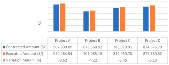 Figure 1 shows the comparison between the contract amount and the executed amount of four SME projects. The variation margin between these amounts ranges from −3.45% to −5.13%, with Project D having the largest margin. These results are consistent with the findings of Asvadurov, Varilla, Brindado, Brown, Knox, and Ellis [], who reported cost overruns of up to 37% in global projects.