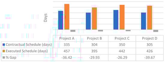 Figure 2 presents the comparison between the contractual schedule and the executed schedule for the same four projects. The percentage of variations in schedule varies between −26.29% and −39.67%, with Project D showing the largest gap. These findings are consistent with those reported by Asvadurov, Varilla, Brindado, Brown, Knox, and Ellis [], who found gaps of up to 53% in global projects.