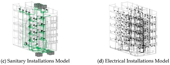 Based on the criteria of Maciel, de Souza and Oliveira [], Project D plans were modeled in Revit, in separate templates for each specialty, with linkage between them. This methodology allowed keeping the templates lighter so that they would not interfere with the computer processing. In addition, by separating the specialties, the possibility of accidental changes in the models of other disciplines was prevented, a risk that can arise when everything is modeled in a single template. The models of each specialty are shown in Figure 3.