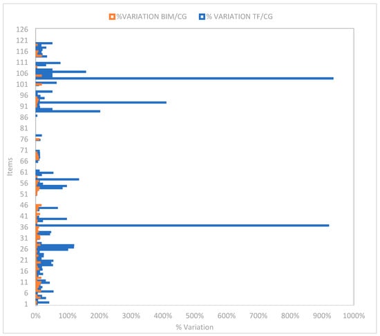 For the validation of the optimization of the costs of the 126 items analyzed in project D, a Control Group (CG) was established following the criteria of Ureta and Chileno [], this group was formed from a manual measurement prepared by the authors, which, after three rigorous reviews, was approved as a reference for the study. The costs obtained through the BIM methodology and the technical file (TF) developed with CAD were compared with this Control Group to evaluate their accuracy, obtaining percentages of variation in each of the 126 items analyzed. Figure 6 shows the percentages of variation of the technical file and BIM in relation to the Control Group. The results show that the technical file presents greater errors, while the BIM methodology offers more accurate data, which supports its effectiveness in cost optimization.