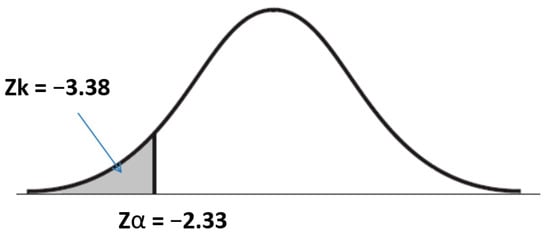 Applying the formula, a value of Zk = −3.38 was obtained. On the other hand, the value of Zα = −2.33 was obtained from the standard normal distribution table with negative Z-scores, considering a confidence level of 99% (α = 0.01).