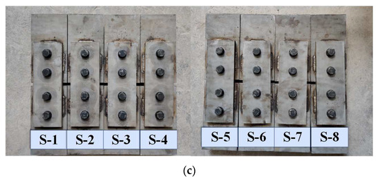 To date, extensive research has been conducted on the strength of combined bolted–welded joints. Shi et al. [1,2,3] carried out experimental and numerical analyses on combined joints with bolts and longitudinal welds, where the design method was given. Waite et al. [4] performed tests on combined bolted–welded joints to reveal the influence of variables including the bolt pattern, bolt size, bolt grade, bolt pretensioning method, faying surface class and weld/bolt strength ratio. Kulak and Grondin [5], Manuel and Kulak [6], Jarosch and Bowman [7] and Kim et al. [8] examined the strength of combined bolted–welded joints and proposed equations to predict the bearing capacity of each part. Liu et al. [9] analyzed the failure mode and shear strength of combined bolted–welded joints using finite element models. Tamimi et al. [10] investigated the behavior of combined bolted welded joints under eccentric loading. Khandel et al. [11] quantified the reliability levels of various elements, i.e., slip critical bolts and longitudinal fillets, based on a probabilistic approach. Kim et al. [12] focused on the strength of combined bolted–welded joints using high-strength steel. Yokozeki et al. [13] researched the intricate mechanics of hybrid joints combining prestressed bolts and adhesive bonding.