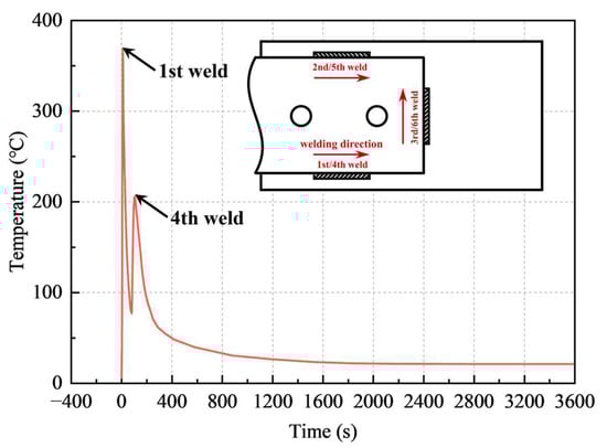 Figure 3 presents the measured time–temperature curve. The welding sequence and directions can also be found in Figure 3. The 1st, 2nd and 3rd passes were used to connect the top lap plate and main plate. Correspondingly, the 4th, 5th and 6th passes were used to connect the bottom lap plate and main plate. During the first welding process, the temperature at the measurement points gradually increased, reaching its peak at 337 °C after about 9 s. Subsequently, the temperature gradually decreased, reaching its trough at 148 °C after approximately 34 s. Then, the temperature increased again, reaching a second peak at 293 °C after 47 s, resulting from the welding of the 4th pass. It can be concluded that all passes after the 1st had small effects on the temperature field at the location of the 1st weld, except for the 4th pass.
