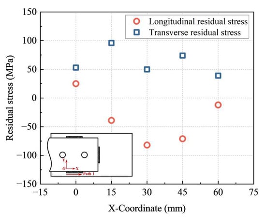 Figure 4 shows the measured residual stresses along path 1 at a distance of 6 mm away from the weld toe. The longitudinal residual stress is along the weld length, that is, in the X direction. The transverse residual stress is vertical to the weld toe, that is, in the Y direction. It was found that both the longitudinal and transverse residual stresses near the welding endpoint were relatively small. Overall, the longitudinal residual stresses were compressive, and the transverse residual stresses were tensile. Also, both the longitudinal and transverse residual stresses were basically symmetrically distributed along path 1.