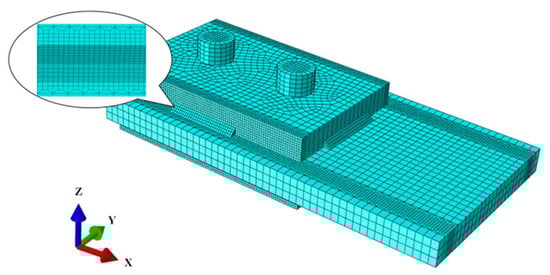 In this study, three-dimensional thermo-elastic–plastic finite elements were developed in ABAQUS to simulate the residual stresses of combined bolted–welded joints. All members including steel plates, bolts and fillet welds were simulated using solid elements. In the thermal analysis, the 3D 8-node linear heat transfer brick element (DC3D8) with temperature as the only degree of freedom was used. In order to facilitate the data mapping between the thermal and mechanical models, the same finite element mesh scheme was used. In the mechanical analysis, the 3D 8-node linear brick element with reduced integration (C3D8R) was used. It has been demonstrated that the use of reduced integration elements achieves better convergence and takes less computational time [42,43,44].
