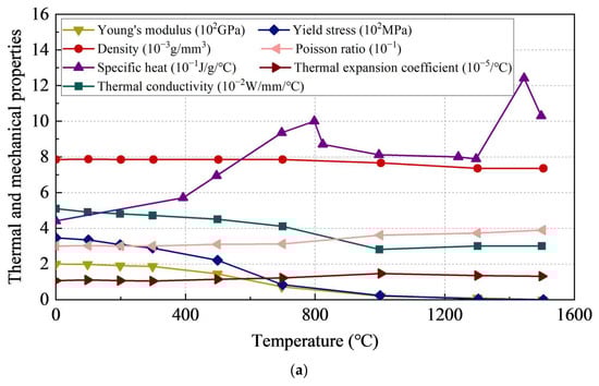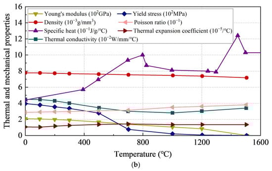 Ideal elastic–plastic constitutive models were employed for the steel plates, bolts and fillet welds, with the same material properties as the specimens. The welding process involves complex thermodynamic issues, and the thermal and mechanical properties of materials change with temperature. This includes changes in the Young’s modulus, yield stress, Poisson ratio and so on. Therefore, it is necessary to consider the effects of high temperatures on steel and electrodes, including the absorption or release of heat during solid and liquid phase transition. The latent heat was taken as 270 J/g, with the solidus temperature at 1450 °C and the liquidus temperature at 1500 °C. The temperature-dependent material properties were adopted from [45,46] and are illustrated in Figure 6.