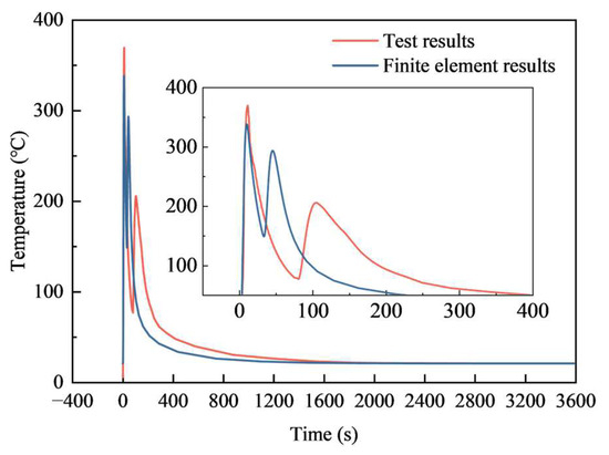 Comparisons of time–temperature curves between test and finite element results.