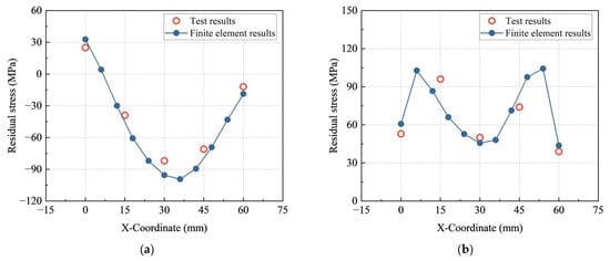 Comparisons of residual stresses between test and finite element results: (a) longitudinal residual stress; (b) transverse residual stress.