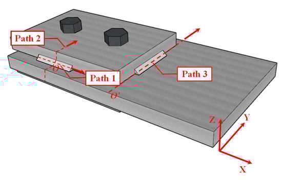 Figure 15 shows the residual stress distribution for different welding speeds. As the welding speed increased, the longitudinal peak stresses along path 1 were 428 MPa, 441 MPa and 487 MPa, respectively, while the transverse peak stresses were 149 MPa, 136 MPa and 185 MPa, respectively. The longitudinal peak stresses along path 2 were 412 MPa, 413 MPa and 447 MPa, respectively, while the transverse peak stresses were 153 MPa, 208 MPa and 225 MPa, respectively. Many scholars have studied the effect of welding speed on the distribution of residual stresses. The analysis results from Ravisankar et al. [48] and Patel S et al. [49] are consistent with those of this study, where the peak residual stress increased with an increase in welding speed. As the welding speed increased, the heat input per unit length gradually decreased, while the penetration depth, weld width and weld pool area decreased. Therefore, the deformation caused by the welding temperature occurred only in a relatively small area, and the ability for synchronized expansion and contraction deformation was weaker, resulting in a larger residual stress.