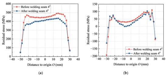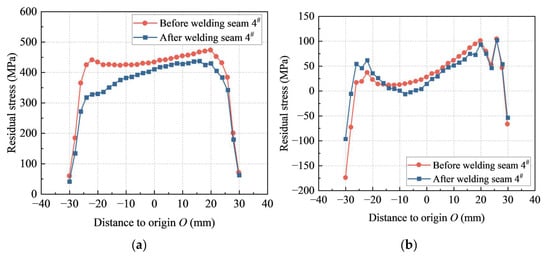 For path 2, the heat-affected zone farther from the seam with lower temperature had longitudinal compressive stresses due to the expansion deformation from higher temperatures in the seam and vice versa, as shown in Figure 12c. The maximum longitudinal residual tensile stress was 434 MPa. The transverse residual stress along path 2 showed no clear pattern but generally exhibited tensile stress with a maximum value of 87 MPa, as shown in Figure 12d. After the welding of seam 4#, the maximum longitudinal residual stress decreased from 434 MPa to 410 MPa, with a reduction of 6%, and the maximum transverse residual stress decreased from 87 MPa to 77 MPa, with a reduction of 11%.