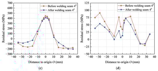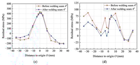 Figure 13 illustrates the residual stress distribution under welding sequence 2. Similar patterns of change in the residual stress distribution along path 1 and path 2 to those for welding sequence 1 were observed for welding sequence 2. After the welding of seam 4#, the maximum longitudinal residual stress along path 1 decreased from 492 MPa to 434 MPa, with a reduction of 12%, as shown in Figure 13a, and the maximum transverse residual stress decreased from −193 MPa to −112 MPa, with a reduction of 42%, as shown in Figure 13b. Also, the maximum longitudinal residual stress along path 2 decreased from 445 MPa to 412 MPa, with a reduction of 7%, as shown in Figure 13c, and the maximum transverse residual stress decreased from 91 MPa to 72, with a reduction of 21%, as shown in Figure 13d.