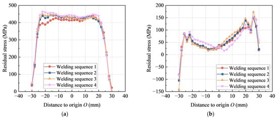 It was revealed in this test that welding seam 4# had significant effects on the residual stresses along seam 1#; thus, it is representative to analyze the respective residual stress distributions along path 1 and path 2, as shown in Figure 11. Also, due to the short welding interval between seam 1# and seam 4# in welding sequences 3 and 4, the residual stress in seam 1# is not fully developed. Therefore, analyzing the effects of seam 4# on the residual stress along seam 1# is of little significance.
