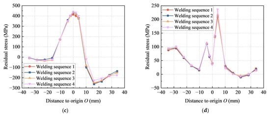 Residual stress distributions after complete cooling for different welding sequences: (a) longitudinal residual stress along path 1; (b) transverse residual stress along path 1; (c) longitudinal residual stress along path 2; (d) transverse residual stress along path 2.