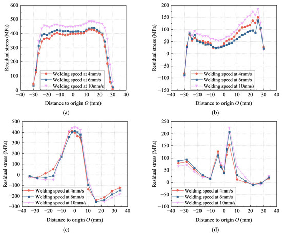 Residual stress distributions for different welding speeds: (a) longitudinal residual stress along path 1; (b) transverse residual stress along path 1; (c) longitudinal residual stress along path 2; (d) transverse residual stress along path 2.