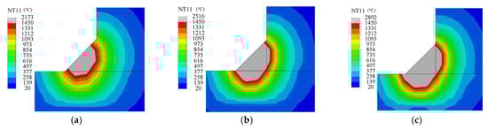 As the welding heat input increased, the weld temperature rose. As shown in Figure 16, the maximum weld temperatures at welding powers of 5000 W, 6000 W and 7000 W were 2173 °C, 2516 °C and 2892 °C, respectively. Under the effects of thermal radiation and heat convection, the weld temperature was transferred to the surrounding base material. Higher welding temperatures meant that a larger area of the base material around the weld reached the liquidus limit of 1450 °C, increasing the cross-sectional area of the weld pool.
