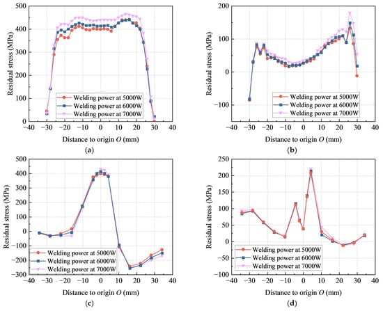 Residual stress distributions for different welding powers at welding speed of 6 mm/s: (a) longitudinal residual stress along path 1; (b) transverse residual stress along path 1; (c) longitudinal residual stress along path 2; (d) transverse residual stress along path 2.