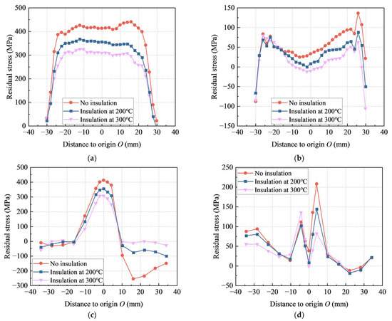Figure 18 shows the residual stress distributions for different post-weld heat treatments. It was found that the longitudinal peak stresses along path 1 for cases of no insulation, insulation at 200 °C and insulation at 300 °C were 441 MPa, 367 MPa and 325 MPa, respectively, while the transverse peak stresses were 136 MPa, 88 MPa and 62 MPa, respectively. The longitudinal peak stresses along path 2 for cases of no insulation, insulation at 200 °C and insulation at 300 °C were 413 MPa, 355 MPa and 308 MPa, respectively, while the transverse peak stresses were 208 MPa, 144 MPa and 82 MPa, respectively. Numerous studies on different welding joints have demonstrated the same trend [50,51]. This showed that post-weld holding, as an effective heat treatment method, had a significant stress-relieving effect on residual stress. It could effectively make the distribution of residual stress at the joints more uniform. As the holding temperature increased, the stress-relieving effect became more pronounced.