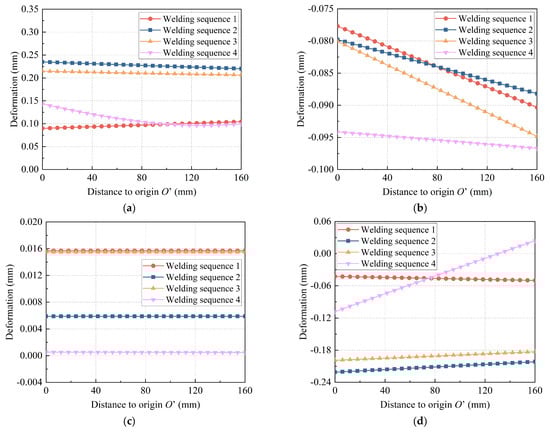 Residual deformation distributions after complete cooling for different welding sequences: (a) total deformation along path 3; (b) deformation in X-direction along path 3; (c) deformation in Y-direction along path 3; (d) deformation in Z-direction along path 3.