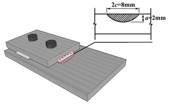 The finite element model of the combined bolted–welded joint with surface cracks was developed using the commercial software ABAQUS. Based on the static analysis results, the maximum stress concentration was located at the weld toe in the middle of the transverse fillet weld. Thus, a semi-elliptical crack with an initial crack length (2c) of 8 mm and initial crack depth (a) of 2 mm was employed, as shown in Figure 20. The left end of the main plate was fixed, and a cyclic displacement with a stress ratio of R = 0.1 and a maximum displacement of 1 mm was applied to the other end.