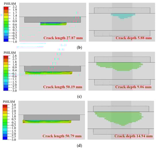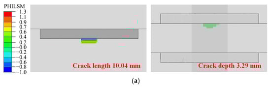 When the crack reaches a certain depth, the structure is no longer able to bear the load. This depth is defined as the critical crack depth. In this investigation, the critical crack depth was taken as the half of the main plate thickness, as specified by the International Institute of Welding (IIW) [52]. Typical finite element results for crack propagation in the combined bolted–welded joint are presented in Figure 21.