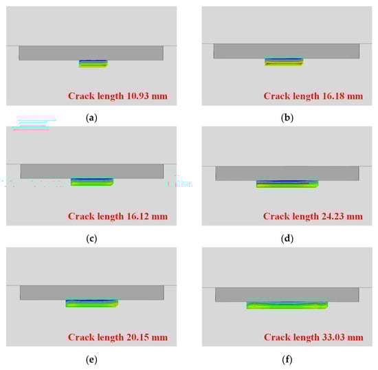 Comparison of crack propagation in the combined bolted–welded joints with and without residual stresses: (a) under 10,000 cycles without residual stress; (b) under 10,000 cycles with residual stress; (c) under 30,000 cycles without residual stress; (d) under 30,000 cycles with residual stress; (e) under 50,000 cycles without residual stress; (f) under 50,000 cycles with residual stress.