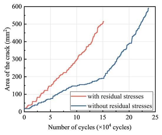Figure 22 shows a comparison of crack propagation in the combined bolted–welded joints with and without residual stresses. With the number of loadings reaching 10,000 cycles, the crack length at the initial stage of crack propagation without residual stress was 10 mm, corresponding to a depth of 3 mm. When the influence of residual stresses was considered, the crack length reached 16 mm, with a corresponding depth of 4 mm. The same phenomenon could be observed throughout the entire cycling process, such as at 30,000 cycles and 50,000 cycles. The results clearly showed that for the same number of cycles, the crack length and depth in the joints were significantly larger when residual stresses were considered.
