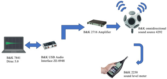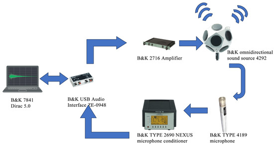 The measurement system was configured as follows. A B&K 7841 Dirac 5.0 Room Acoustics Software was used on a computer to generate logarithmic sine-sweep (e-sweep) signals. These signals were amplified using a B&K USB Audio Interface ZE 0948 sound card and a B&K 2716 power amplifier, and then played through a B&K 4292 omnidirectional dodecahedron loudspeaker. After propagating through the lounge, the sound was captured by a B&K 4189 omnidirectional microphone, further amplified using a B&K 2690 Nexus conditioning amplifier, and finally digitized by the ZE 0948 sound card before being transmitted to the computer. The system’s configuration is illustrated in Figure 3. The recorded signals were processed using Dirac 5.0 software to perform deconvolution and obtain the impulse response data for analysis. A detailed list of the instruments and their key specifications, as extracted from the manufacturers’ datasheets, is provided in Table A1 of Appendix A. This table includes model numbers, frequency ranges, dynamic ranges, and other relevant parameters to offer a clear overview of the measurement chain used in this study.
