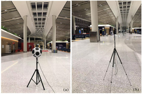 To maintain the reliability of the measurements, environmental noise was strictly controlled. Measurements were conducted when the departure lounge was not in operation, with the air conditioning system turned off and no occupants present. All doors and windows were kept closed to minimize external noise intrusion, ensuring that the background noise level met the NR30 curve requirement. This setup provided a high signal-to-noise ratio and reliable measurement data. Figure 4 shows on-site photos of the sound field measurement, where Figure (a) represents the sound source arrangement, and Figure (b) represents the measurement receiving point.
