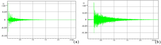 In this study, impulse responses were measured at receiver positions both closer to and farther from the sound source, aligned along its central axis, to investigate differences in sound wave propagation characteristics within large, elongated spaces. Figure 6 illustrates the impulse responses at two representative receiver positions in Pier A: Figure 6a represents the receiver position closer to the source (Receiver Point 1), while Figure 6b corresponds to the receiver position farther from the source (Receiver Point 8).